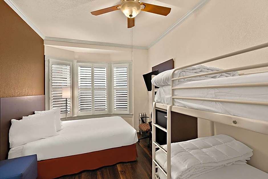 Room includes a TV and an private bathroom. A microwave and small fridge are also provided. This family friendly room includes a queen bed and a bunk bed.